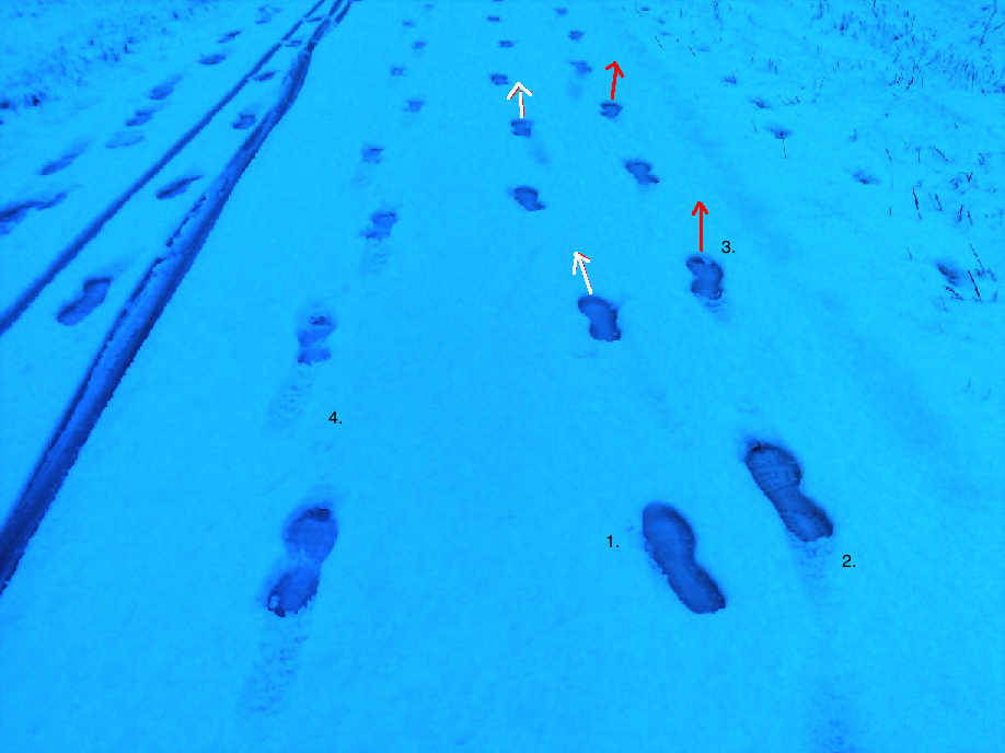 Valged nooled on suunatud peaaegu järgmise parema jala kannajälje suunas. Ma muidugi kõnnin ka varbad otse, kui paljud juba kõndides viivad varbad välja ja ega siis jooksusammul seda väga muuta ei õnnestu.
