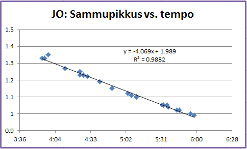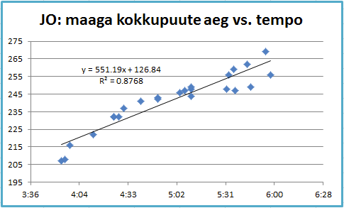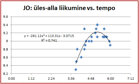 Joonistasin siia paraboolse seose, aga see ei pruugi tegelikult tõde näidata. Andmeid ei ole üleliia palju ja tegu võib olla ka minu jooksutehnika iseärasusega.