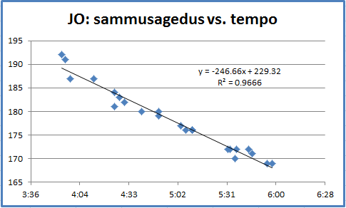 …näeme, et nende andmete põhjal seletab sammupikkus isegi natukene suuremal määral (99%) tempot, kui sammusagedus (97%), aga me ei räägi siin statistiliselt usaldusväärsest muutusest.
