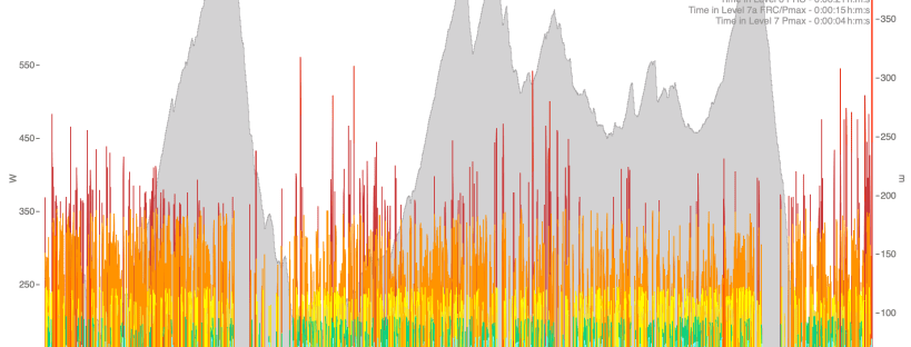 Maastik dikteerib ja jõurakendus on väga variatiivne (ilusad värvilised pulgad ülemisel pildil) – vajades erinevate füsiloogiliste süsteemide väga kõrget sooritusvõimet ka nii pikal distantsil. Ja kuigi seda ei juhti võibolla nii tihti, siis mõnikord on seal vaja ka maksimaalset sprindivõimekust – vaata erapunane peak päris lõpus.