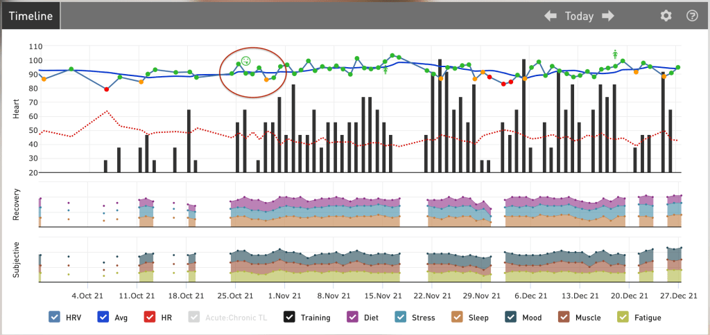 „Eilne PCR-test oli positiivne. Enesetunne pigem hea, kerge nohu. Öö oli rahutu, kuna olen sellest üsna stressis.“ Selliselt kommenteerib sportlane oma seisundit HRV ehk pulsi variatiivsuse mõõtmise äpp’is ja punane täpike terendab ohumärgina ekraanil (vaata Graafik 1, sõõriga tähistatud). Samas märkan, et alumine punane punktiirjoon pole märgatavalt tõusnud ehk hommikupulss on normaalne. Siiski otsustame anda paar puhkepäeva ja jälgida olukorda. Aga kuna tundus, et põhiline stressiallikas tuli vaimsest poolest ja mitte kehalisest, siis saime lõpuks suhteliselt kiiresti edasi liikuda. Läks õnneks.