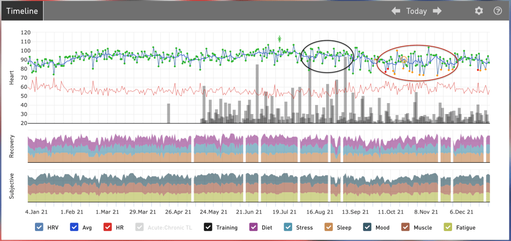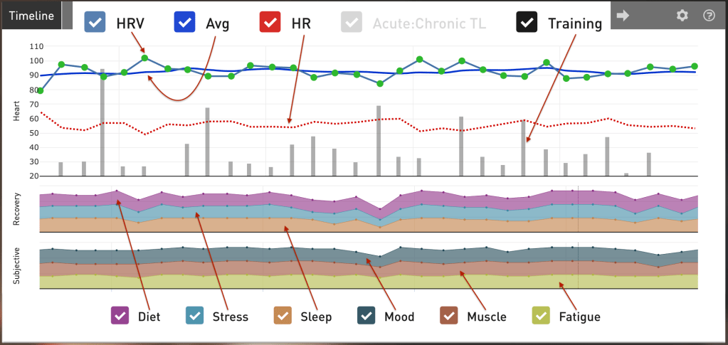 Samas fluktueerib HRV päevast päeva olenevalt igapäevastest tegevustest ja mentaalsest staatusest (rohelised täpid graafikutel). Mõnikord tõuseb HRV, kui parasümpaatiline närvisüsteemi aktiivsus on tõusnud või hoopis on sümpaatilise närvisüsteemi osakaal langenud. Igal juhul, mida adekvaatsemalt need kaks autonoomse närvisüsteemi osa omavahel koostööd teevad, seda funktsionaalsem ja tervem inimene on. Aga kujuta nüüd ette, et inimene on krooniliselt stressis või ülekoormatud. Sellisel juhul võib keha jääda kinni sümpaatilisse närvisüsteemi ehk olla pidevalt „võitle või põgene“ seisundis madala HRV’ga – ka siis, kui ta magab. Arusaadavalt võib see olla väga koormav organismile nii füüsiliselt, kui ka vaimselt.